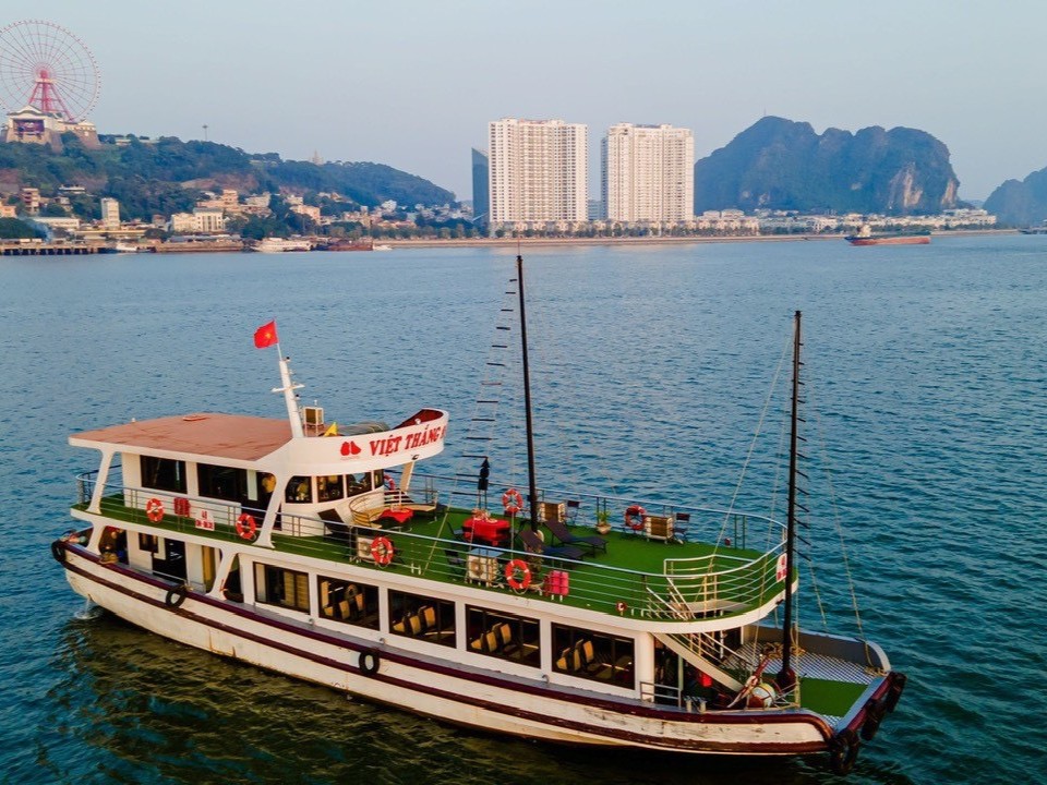 12:15 Arrive at Tuan Chau Harbor, welcome aboard, and safety briefing. Start the 6-hour journey to explore Halong Bay, passing through thousands of limestone islets, including Cock Fighting and Thumb, while enjoying mouth-watering Vietnamese lunch on the boat.